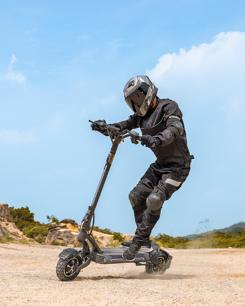 Experience intense acceleration and hill-climbing capability with dual 1000W brushless motors, delivering up to 2184W of peak power. Tackle steep inclines of up to 46% and reach exhilarating speeds of 41 MPH, supported by three selectable riding modes: Eco, Sport, and Race.